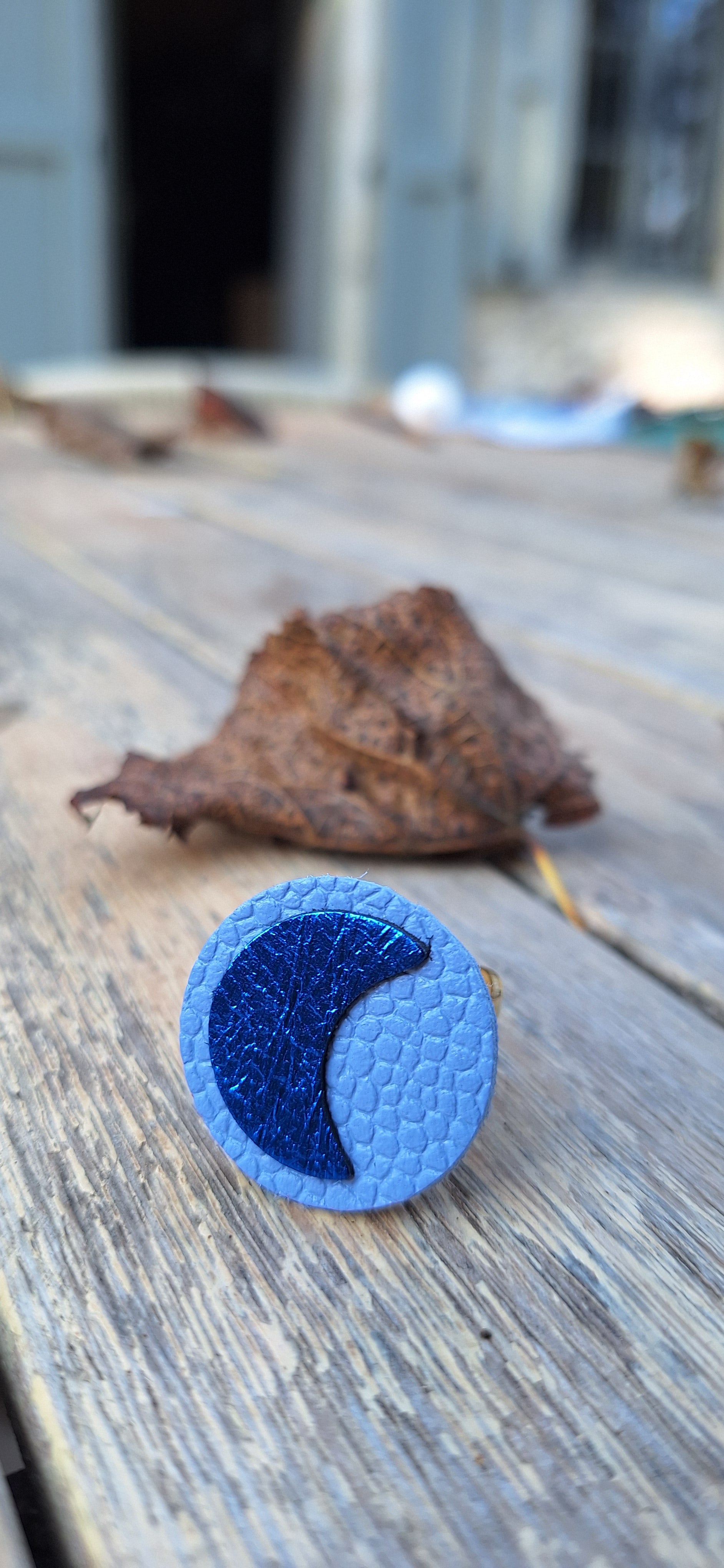 - Motif en cuir en forme de lune (Loargann signifie "clair de lune" en langue bretonne), environ 2,5cm de diamètre